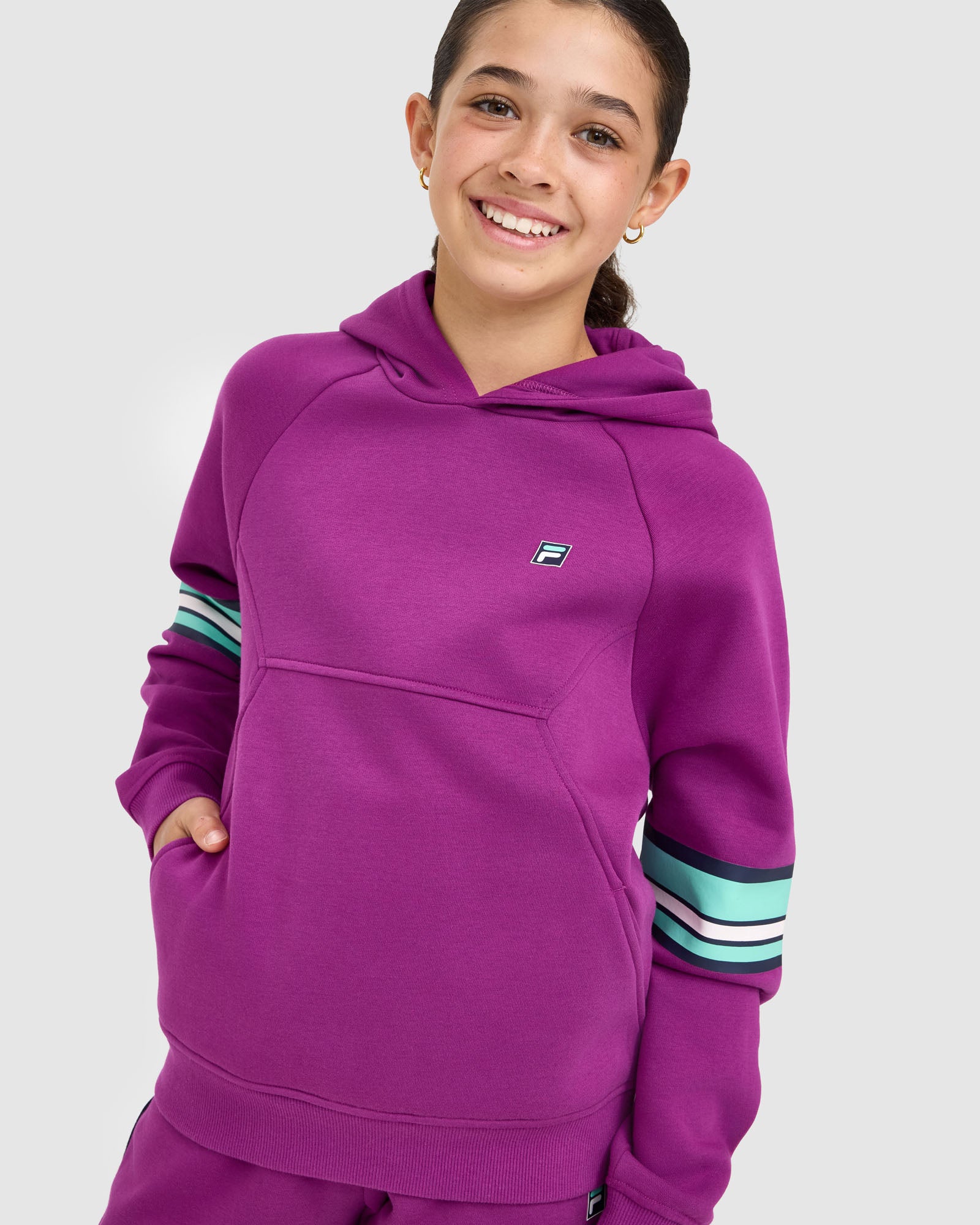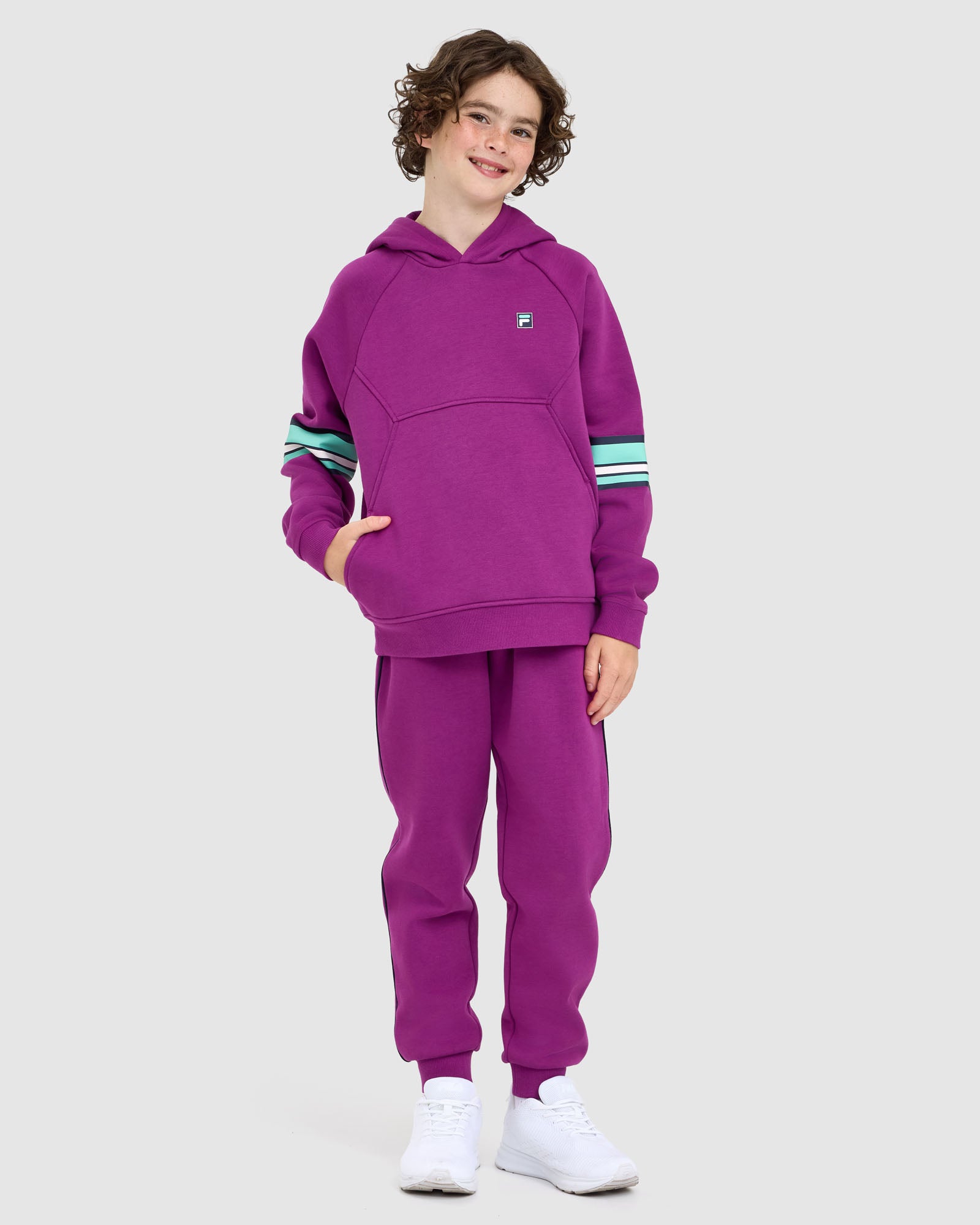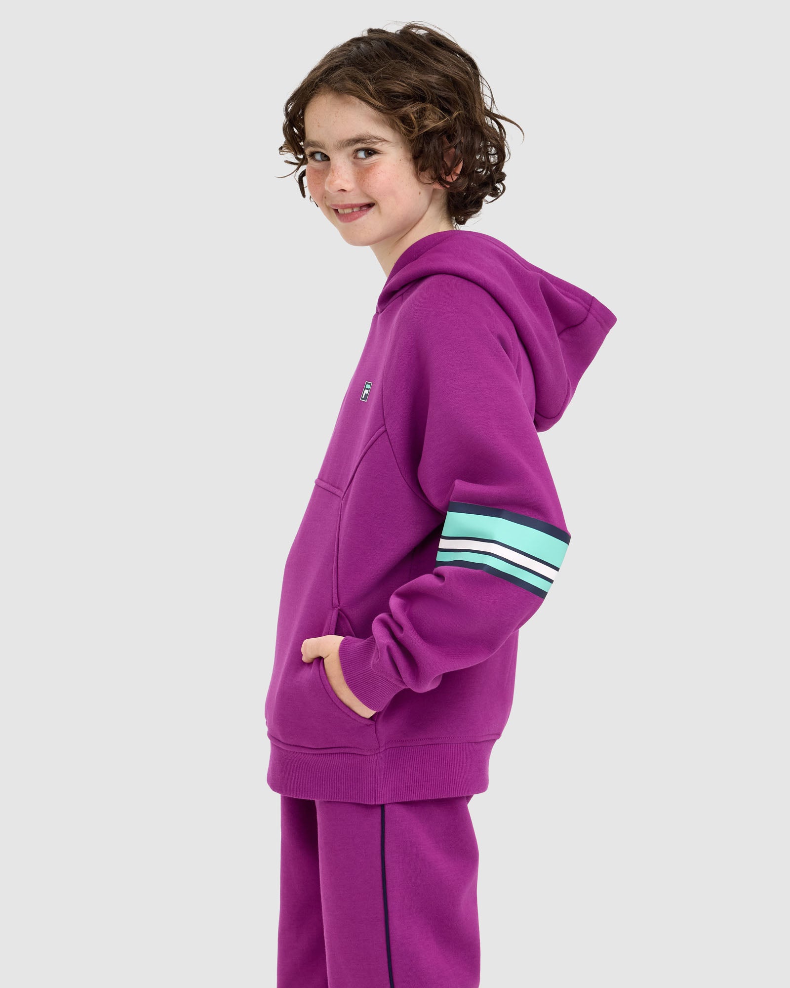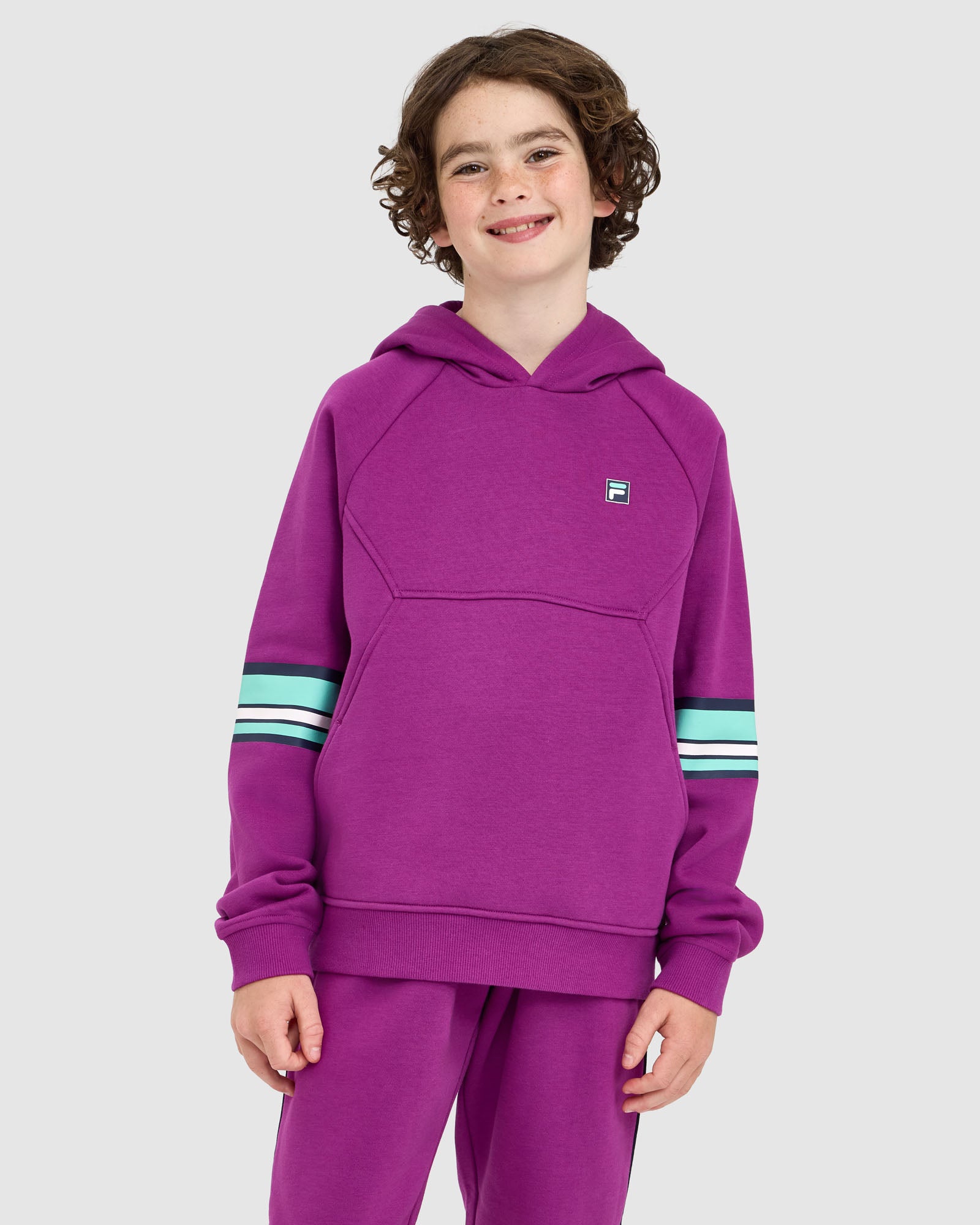 Sporty and comfortable, our Kids Quinn Hood is built for everyday wear. It features a lined hood with logo neck tape, relaxed drop shoulders, and front splicing detail with seam pockets. Finished with rib cuffs and hem, plus an F-box logo print at the left chest and bold stripe prints down the sleeves.