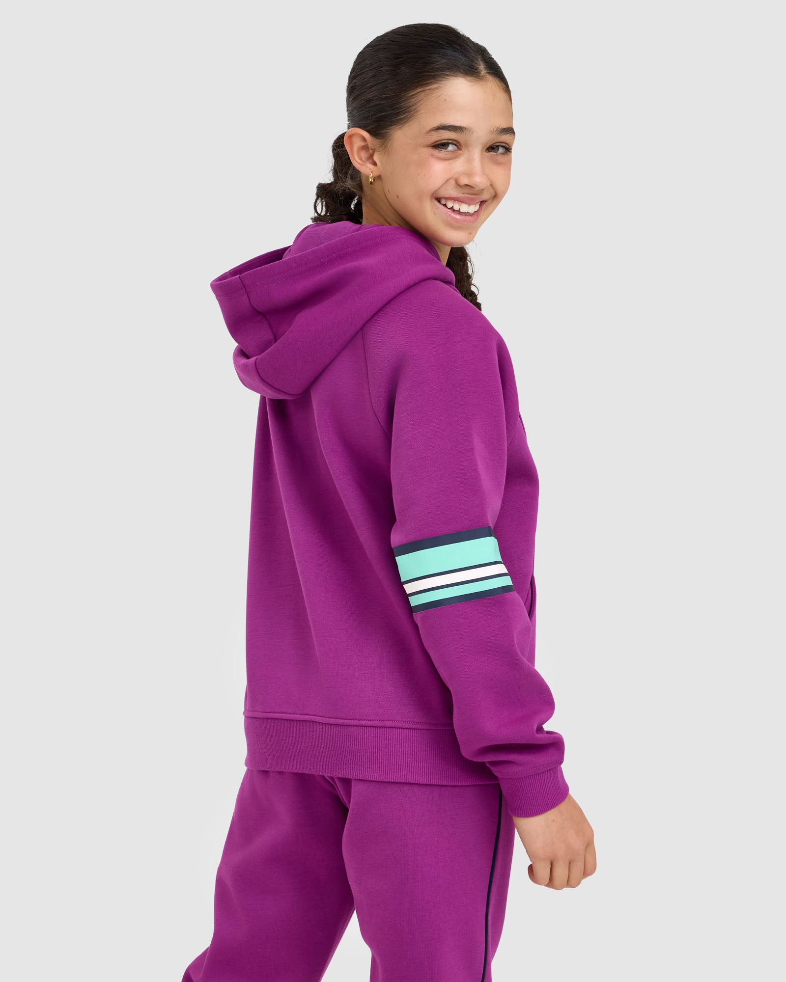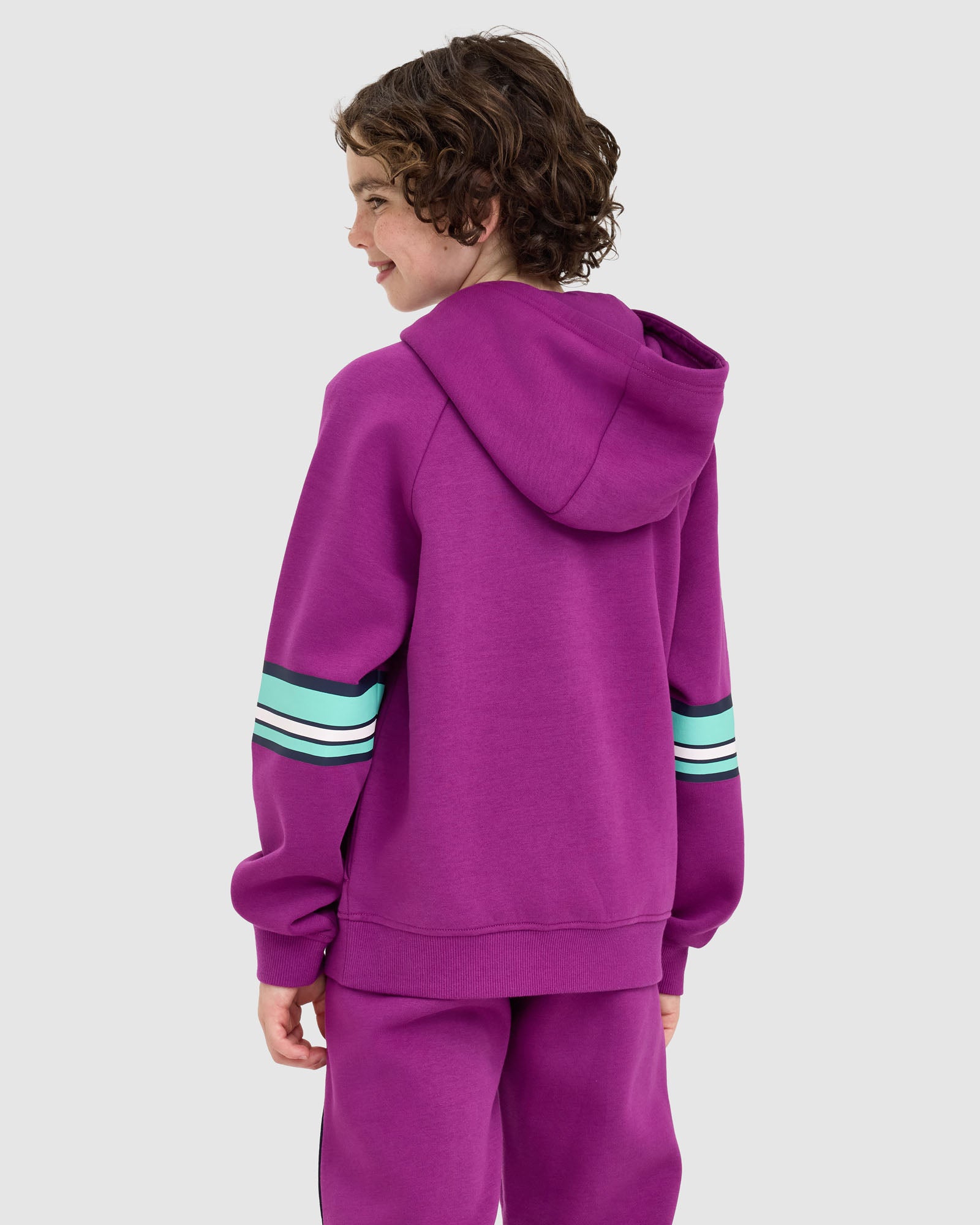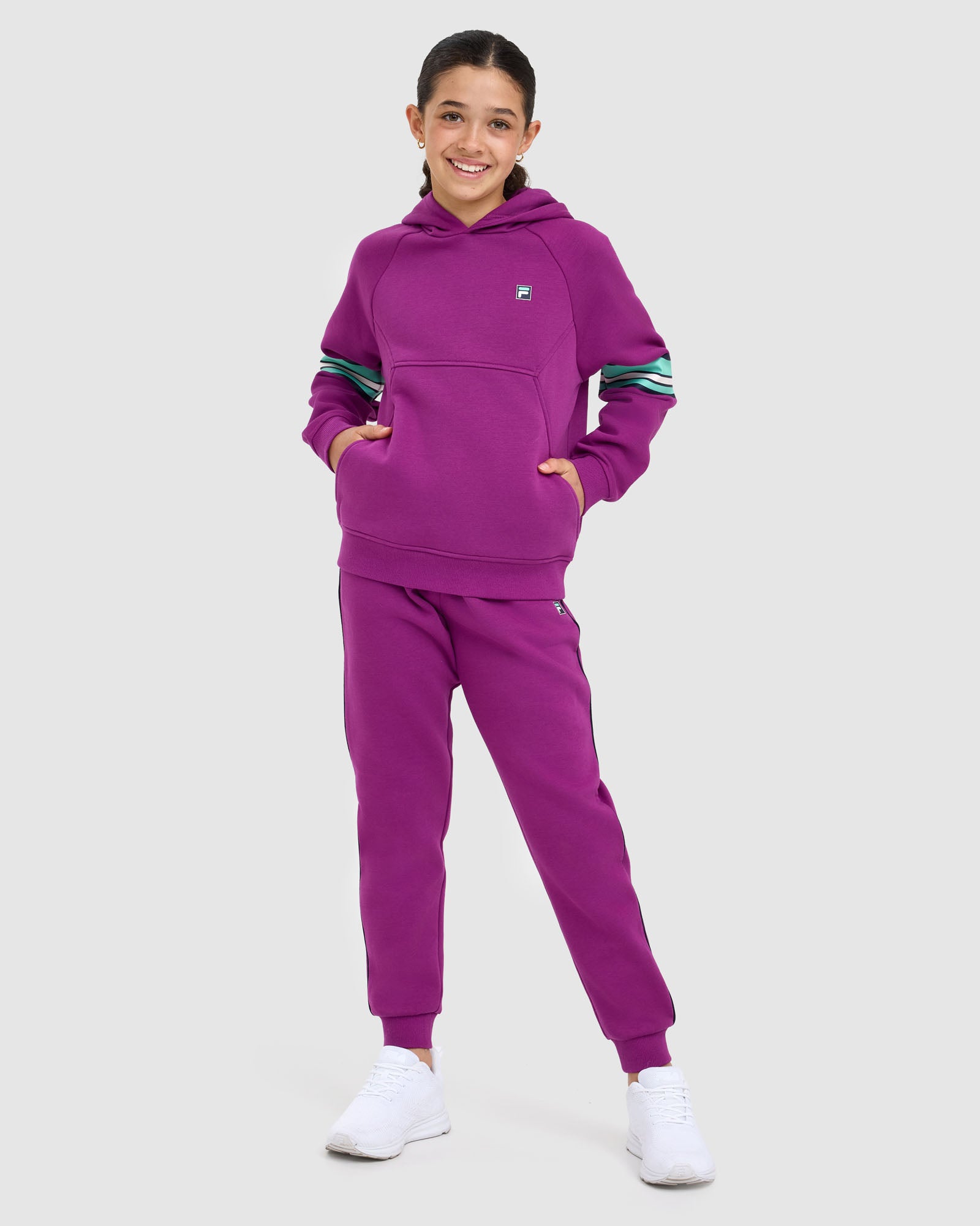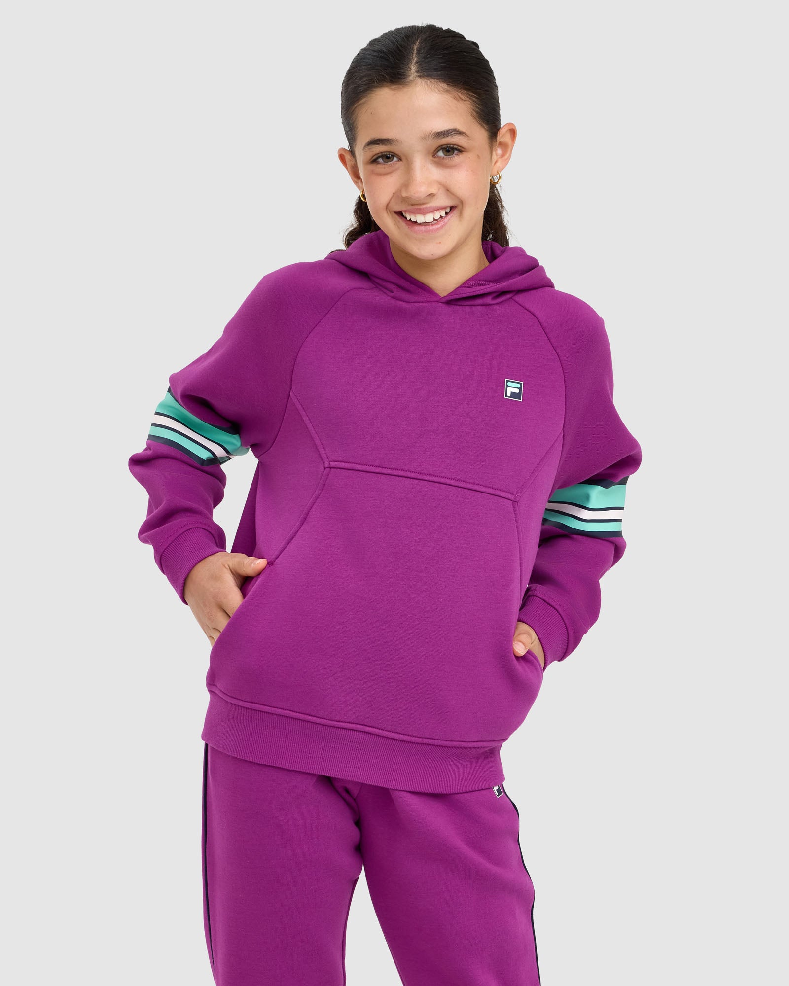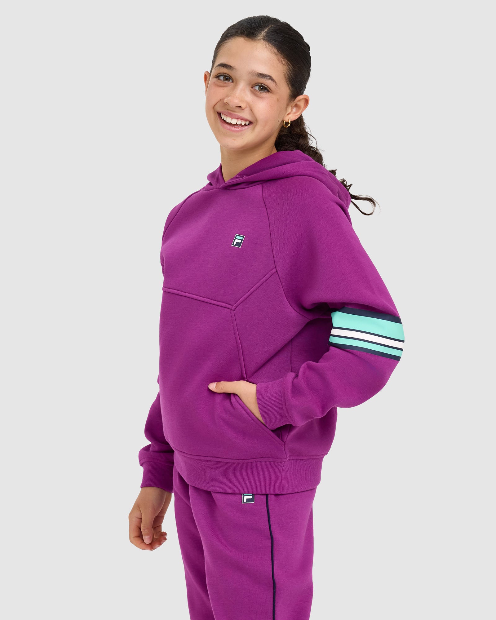 Sporty and comfortable, our Kids Quinn Hood is built for everyday wear. It features a lined hood with logo neck tape, relaxed drop shoulders, and front splicing detail with seam pockets. Finished with rib cuffs and hem, plus an F-box logo print at the left chest and bold stripe prints down the sleeves.